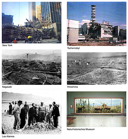 | dem eine Bombenexplosion stattgefunden hat oder stattfinden soll. Der Ground Zero ist somit der Punkt mit den höchsten Schäden durch die Bombenexplosion. Der Begriff stammt aus Fach- und Militärkreisen und wurde fast ausschließlich im Zusammenhang mit nuklearen Explosionen verwendet. Die 5 bekannten Orte, die den Namen Ground Zero tragen und als Diorama zu sehen sein sollen, liegen in Los Alamos (USA), wo 16.07.1945 die erste Versuchs-Atombombe gezündet wurde, in Hiroshima (Japan), wo am 06. 08.1945 die Atombombe "Little Boy" abgeworfen wurde, in Nagasaki (Japan), wo am 09.08.1945 die Atombombe "Fat Man" abge-worfen wurde, in Tschernobyl (Ukraine), wo am 26.04.1986 im vierten Block des dortigen Atomkraftwerkes ein nuklearer Zwischenfall eintrat (Bezeichnung "Ground Zero" lediglich durch US-Behörden verwendet) und in New York, wo am 11.09.2001 die Gebäude des World Trade Centers durch eine terroristischen Anschlag zerstört wurden. In dem Video, welches in einem seperaten, abge- dunkelten Raum gezeigt wird, sind Interview mit Besuchern des Ground Zero`s in NY zu sehen. Es geht um Fragen, was Ground Zero für siebedeutet, warum sie hier sind und sich diesen Ort an- schauen, was sie erwarten. Ist es eine weitere Attraktion auf einer NY-Stadtrundfahrt? Ein weiterer Aspekt dieser Arbeit ist deshalb auch neben der Auseinandersetzung mit dem Begriff "Ground Zero" die Thematisierung der Sensationslust des Betrachters. Es soll die ambivalente Anziehungskraft von z.B. Unfällen, Straftaten, jeglichen Leids, mit der die Medien erfolg reich arbeiten, gezeigt werden. Oft ist es ein perfider Mechanismus, der ausgelöst wird. Wenn z.B. ein hungerndes Kind aus Afrika im Fernsehen gezeigt wird, um zum Spenden aufzu- rufen, ist es oft nur Auslöser von Gefühlen wie: `es geht uns doch sogut` oder `unsere Sorgen hier sind banal gegen deren Probleme`. Und beim folgenden Persilwerbespot geht es allen gleich viel besser. Die Besucher der Ausstellung können sich die realitätsnahen Dioramen ansehen oder auch davor fotografieren lassen und mit der karthatischen Wirkung der betrachteten Schreckensbilder wiederin ihren Alltag zurückkehren. Die Dioramen (3x3x2m) sollen liebevoll und detailreich gebaut sein. Generell werden im Vordergrund Trümmer liegen, die plastisch ausgearbeitet sind und dadurch skulpturale Wirkung haben. Verbunden durch eine Hohlkehle gleitet der Vordergrund in den ausschließlich gemalten Hintergrund. Es gibt vor jedem Diorama eine informative Tafel. Der Film läuft gebeamt in einem abgedunkelten Raum. Es ist wichtig einen Ausstellungsraum außerhalb des Kunstkontextes in einem naturhistorischen Museum, Heimatmuseum oder Völkerkundemuseum zu finden. |